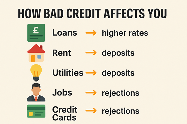 Insurance companies check your credit. Some ask for hundreds of pounds upfront instead of monthly payments. The credit card companies reserve their best deals for good credit holders. You’ll miss low interest rates and rewards programs. The cards available to you might charge 30% interest or more.